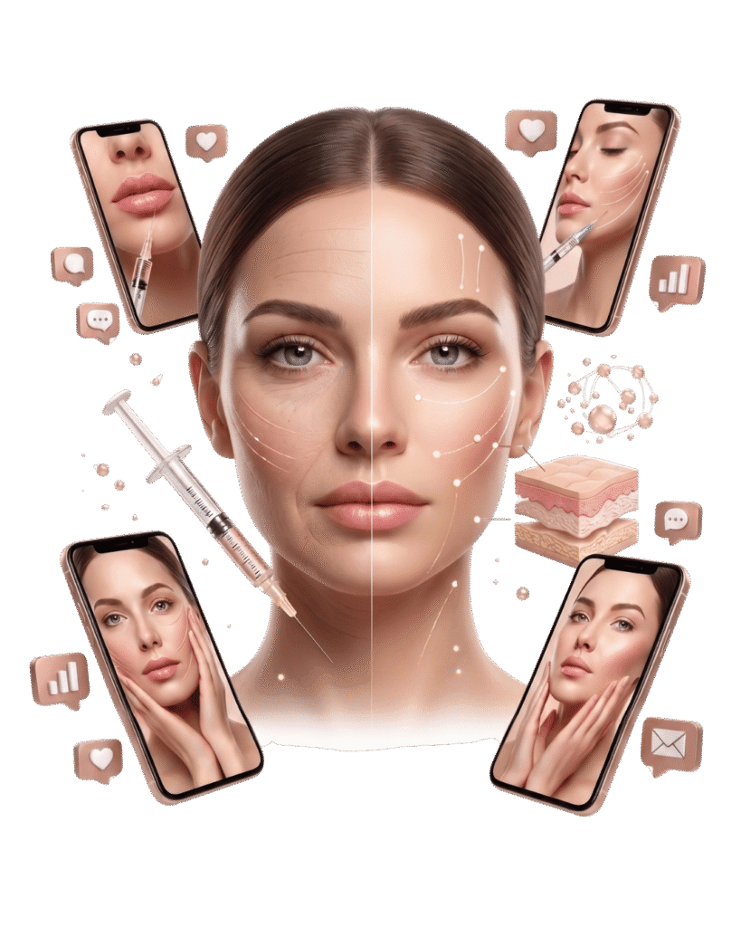 Conteúdo visual de alta fidelidade para explicar procedimentos injetáveis, combater o envelhecimento e projetar máxima autoridade e sofisticação clínica.